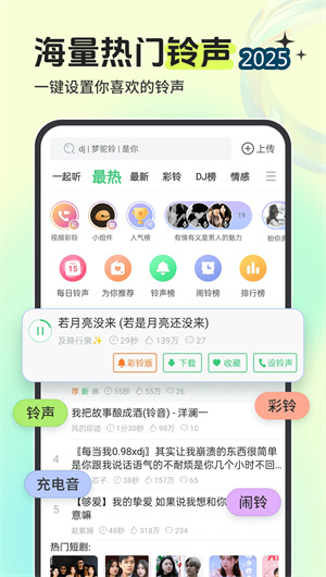 铃声多多App是中国领先的移动音视频娱乐平台,与三大运营商音乐基地建立战略合作,构建了完整的个性化音频视频服务生态。该平台整合了手机铃声、彩铃服务、视频彩铃、动态壁纸、来电秀展示等多元功能模块,通过智能推荐算法和社交互动体系,为用户提供一站式的个性化设备定制解决方案。凭借百万级高品质铃声资源库和创新的DIY音频剪辑工具,平台实现了从内容消费到创意生产的完整闭环。其独特的多人在线互动功能和实时更新机制,持续推动移动娱乐体验的升级,让每位用户都能轻松打造独具个性的数字生活空间。