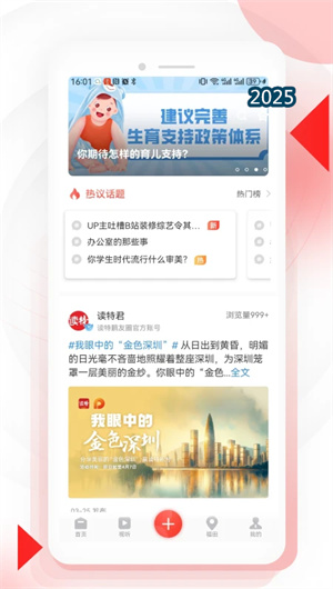 读特客户端是深圳报业集团倾力打造的新闻类深圳门户客户端,作为深圳市委市政府的权威移动发布平台,该应用深度融合了传统媒体的专业素养与新兴技术的传播优势。平台立足于建设中国特色社会主义先行示范区的战略定位,聚焦中国改革开放的实践与探索,构建起覆盖粤港澳大湾区的立体化新闻传播体系。通过专业原创新闻生产机制、智能内容分发网络与多媒体形态融合,读特App不仅实现了对深圳权威资讯的全天候传递,更形成了集图文、视频、直播、数字报于一体的全媒体内容矩阵。其独创的"深圳号"政务聚合平台与IN视频板块,重新定义了移动互联网时代的新闻阅读体验,成为海内外用户"读懂深圳,读懂未来中国"的重要窗口。