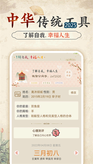 2. 传统文化查询功能运用国学算法引擎开发的个人命理分析系统,通过五行平衡计算与属相特征分析提供独特的个人特质解读。该功能创新的人格类型匹配将传统五行理论与现代人格心理学相结合,形成更具文化特色的人格分析模型。通过个性化建议生成基于分析结果提供生活、事业等方面的实用指导,帮助用户在传统文化智慧中获得启发。