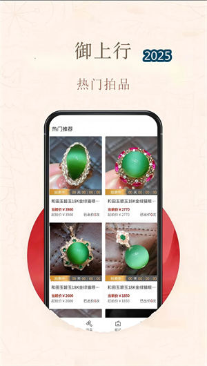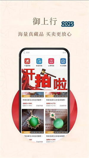 御上行App是专注于珠宝玉石、文化艺术品、大健康产品与地标农副产品四大核心领域的创新型数字平台,构建了集O2O拍卖、专业品鉴与文化传播于一体的新零售共享生态系统。平台以"人人参与"为核心理念,通过创新性地融合线上直播拍卖与线下体验中心,打造出兼具趣味性、赏识性、效益性与共享性的全新交易模式。平台深度整合供应链资源,显著简化传统商品流通环节,依托专业的品鉴团队和权威的鉴定体系,确保每件商品的真伪与品质。目前,平台已建立起完整的数字藏品档案库、智能估价系统和沉浸式展示平台,让收藏爱好者能够便捷地收藏到心仪珍品,真正实现"人人可握灵蛇之珠,家家可抱荆山之玉"的收藏理想。