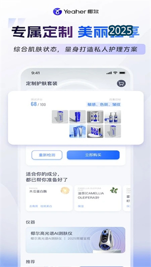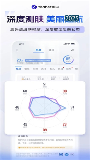 椰尔App的核心功能在于其自主研发的智能多模态肤质检测系统。该系统支持用户通过手机高清摄像头与定制化外接检测设备两种方式进行检测。云端图像分析引擎利用深度学习算法,从采集的肤质影像中提取毛孔密度、纹理粗糙度、红区色斑分布、油脂分泌水平及水分含量等15个维度的关键生物特征指标。同时,用户需完成包含生活习惯、环境因素、护肤历史的问卷评估,椰尔的综合评估模型会融合多源数据,生成一份详尽的“肌肤数字档案”与可视化评估报告。报告不仅量化各维度得分,更会标注肌肤问题的成因链与风险等级,为后续方案定制奠定科学基础。