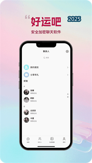与主流社交软件不同,好运吧的定位清晰锁定于 “熟人好友” 间的私密沟通。其社交关系建立机制倾向于通过离线方式交换安全识别码或限时有效的邀请链接,而非开放的手机通讯录批量导入或基于位置的随机推荐。这确保了好运吧好友列表中的每一个联系人都是经过用户主动、慎重选择的真实熟人。这种设计形成了小而坚固的信任闭环社交圈,从根本上降低了因社交图谱暴露或陌生人骚扰带来的风险。所有通讯功能,包括加密群聊,都围绕这个封闭的信任圈设计,使得安全防护措施能够更精准、更有效地服务于真实的隐私保护需求。