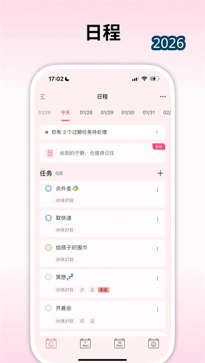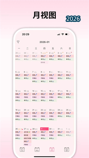 1. 日程管理与多视图切换: 纯纯周记的日程管理功能摒弃了复杂的设置,回归计划本质。用户可以轻松创建日程,设置重复任务(如每天、每周、每月),添加标签分类。周视图和月视图自由切换,让用户一眼看到每天是否有安排、是否完成。更独特的是,视图中同时标记“是否写过日记”,将计划与记录自然连接。例如在月视图中,每个日期下方都有一个小圆点,写日记的日期亮起,未写的保持灰色——时间分布和生活记录一目了然。这种设计让计划不再是冰冷的待办清单,而是有温度的生活轨迹。