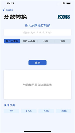 分数运算是一款基于Swift架构的专业数学学习应用,深度融合分数算法与可视化教学理念,通过动态演示系统构建直观的分数运算生态。该平台运用核心计算引擎驱动分数转换机制,实现通分约分的智能化处理,依托本地存储保障数据安全持久。分数运算整合了计算器模块、练习系统、历史记录等核心功能,通过多维度展示提供全面的学习支持,形成完整的数学学习解决方案。软件采用原生开发确保系统流畅性,配合界面优化提升操作体验,为iOS用户提供从基础运算到进阶理解的一体化服务,真正实现数学思维的培养价值。