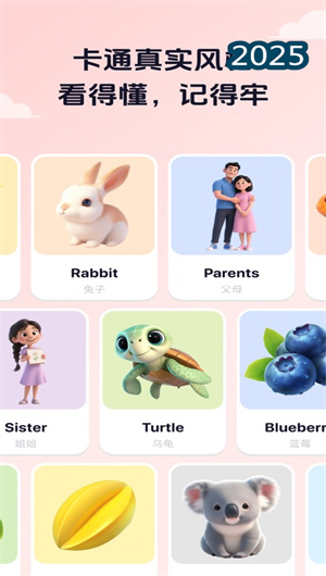 平台构建科学单词卡片库,每张卡片采用真实认知插画与可爱形象设计相结合的方式,通过视觉记忆强化帮助幼儿建立单词形象关联。系统基于认知发展阶段智能推送适龄内容,支持全屏沉浸学习与快速列表复习两种模式自由切换。配合自然发音示范和重复记忆机制,确保幼儿在愉悦学习体验中掌握核心词汇,目前词汇库已涵盖1000+必备单词。