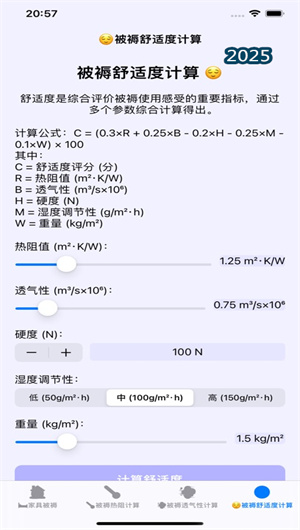 家具被褥APP以其科学的热阻计算、精准的透气性分析和全面的舒适度评估,重新定义了被褥选择与优化的方法论。它不仅是注重睡眠质量用户的个人顾问,也是家居用品研发者的参考工具和销售人员的服务助手。通过将复杂的寝具性能转化为直观的量化指标,家具被褥APP成功架起了专业科学与日常生活之间的桥梁,让每一位用户都能依托数据决策,享受真正意义上的科学好睡眠。