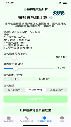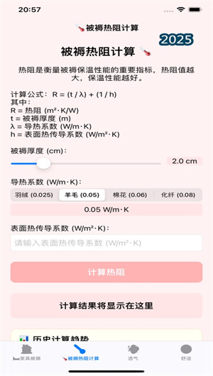 家具被褥APP的核心功能是其专业的热阻计算能力,能够通过输入被褥的填充物类型、厚度、密度等关键参数,精准测量其保温性能的量化数值。该系统基于严谨的热力学模型,计算出被褥的热阻值,并以此为依据,结合用户所在地的季节气候特征,智能匹配最适合的被褥厚度与材质建议。无论是夏季的轻薄需求还是冬季的保暖要求,该功能都能提供科学的四季适宜推荐,帮助用户构建始终如一的舒适睡眠微气候。