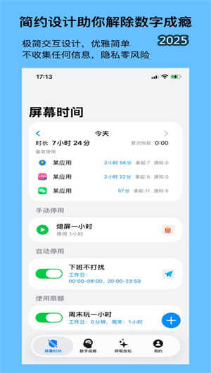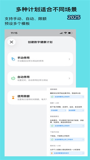 平台提供完善的数字健康计划库,包含手动停用、自动停用、每日限额等多种干预模式。每种计划都经过心理学专家优化设计,适配学习、工作、休息等不同场景需求。用户可根据个人情况选择预设模板或创建自定义计划,系统会通过智能提醒功能确保计划执行。特别设计的渐进式限制方案能有效降低戒断反应,通过分阶段减少屏幕使用时间,帮助用户平稳过渡到健康的使用状态。