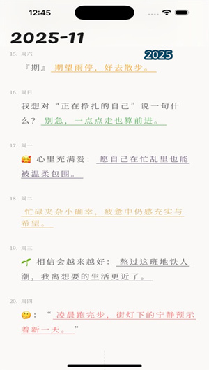 2. 软件提供了清晰直观的时光回顾系统与时间轴视图。所有被记录的句子都会按照时间顺序,在个人时间轴上线性排列,形成一条唯美的记忆流。当用户回头翻阅时,可以通过快速回溯功能流畅地浏览过往岁月。这种视觉呈现方式,使得每一句简短的话语都能在时间的语境中焕发出新的意义,让用户真切地感受到“一句话也能承载时光的厚度”,极大地增强了回顾体验的连续性与情感冲击力。