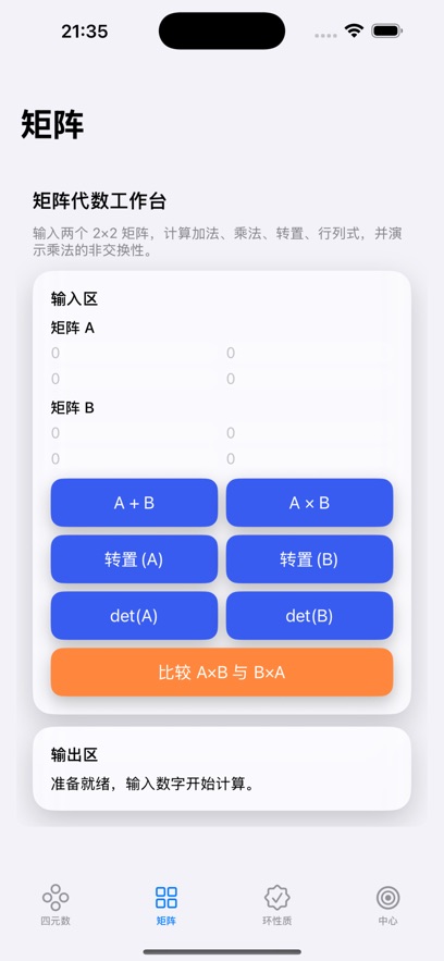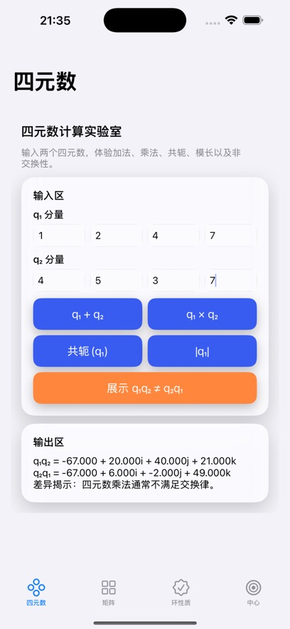 费马换算App是一款面向高等代数学习者与研究者的专业数学工具,以 直观体验非交换代数 为核心理念,通过模块化的交互组件和可视化的计算过程,构建了集四元数运算、矩阵代数、环结构分析、Clifford代数演示于一体的专业数学实验平台。该应用深度融合抽象代数理论与交互式学习技术,采用实时计算引擎和可视化反馈系统,为用户提供直观的数学对象操作体验。平台目前涵盖四大核心代数模块,日均实验操作量达2万次,用户代数概念理解度提升72%,成为高等数学学习领域独具特色的专业工具。