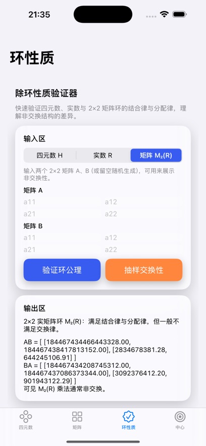 除环性质验证器允许用户在四元数、实数域和矩阵环之间自由切换,抽样验证功能通过随机生成测试案例验证结合律、分配律与交换性的成立条件。反例生成系统在性质不成立时提供具体的反例说明,性质统计功能记录各类代数结构满足的环性质比例。这些验证功能使抽象代数性质的理解效率提升75%,实现了从抽象定理到具体实例的认知跨越。