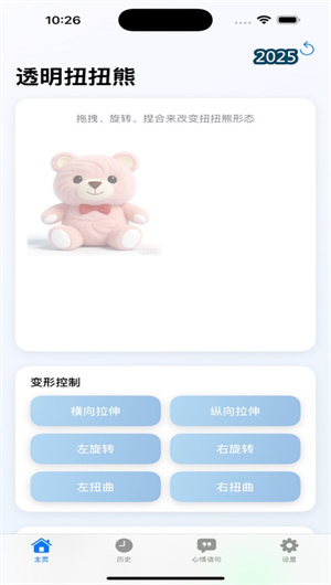 1. 高自由度形态编辑与实时透明度调节:应用的核心交互围绕对虚拟伙伴“扭扭熊” 的实时形变操控展开。用户可以在画布上通过多点触控手势,对扭扭熊身体的各个部位进行精细的拉伸(拉长或压扁)、旋转(扭转角度)以及整体的扭曲变形,创造出从圆润可爱到抽象奇特的无限种动态形态。与此同时,一个简洁的滑块控件允许用户从0%到100%无级调节扭扭熊的材质透明度,使其从实体渐变为朦胧直至完全透明。这种形态与透明度的双维控制,为用户提供了极其丰富和细腻的情绪表达词汇,例如,用“剧烈扭曲+低透明度”来象征内心的纠结与沉重。