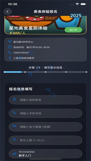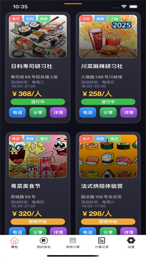 1. 主题化美食聚社活动与一站式报名管理:应用的核心社交引擎是多样化、主题鲜明的“美食聚社俱乐部”。用户可以根据兴趣、地理位置、口味偏好,浏览和加入不同的聚社,如“周末轻食Brunch聚社”、“中华面点研习社”、“环球美食探索家”等。每个聚社会定期发布线下聚餐、烹饪工作坊、食材探店或线上分享会等活动。用户可查看活动详情(时间、地点、费用、菜单),并通过集成的活动报名系统一键完成报名。所有已报名和已参加的活动信息,都清晰地汇集在“我的报名记录”板块中,方便用户统一查看、管理日程,并可随时查看历史活动精彩回顾,形成个人专属的美食社交档案。