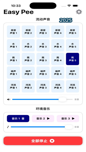 2. 可定制化音频环境构建器 允许用户在核心水声基础上,叠加一层舒缓背景音乐层。这些音乐专为诱导副交感神经激活而设计,采用低频双耳节拍、自然频率音阶及无旋律环境音效,旨在从生理层面促进盆底肌肉群的深度放松,降低因紧张导致的尿道括约肌痉挛。用户可通过独立音量控制面板分别调节治疗性水声与放松性音乐的音量,实现听觉引导平衡,这种双重音频引导策略被用户报告可将放松准备时间平均缩短约 65% 。