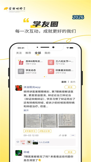1. “学友圈”社群平台 是杏林明师App的社区核心,该功能采用兴趣小组架构,用户可根据学习方向加入经方研习组、针灸交流组、小儿推拿组等专业社群。每个社群都设有打卡学习区、病例分享区和资源交流区,并配备社群助教提供日常指导。平台引入学习伙伴匹配算法,根据用户的学习进度、地域和兴趣偏好推荐合适的学友,促进同伴学习效应。社群内还定期举办专题学习挑战赛,通过积分激励体系鼓励学员参与讨论与分享,形成积极互动的学习氛围。