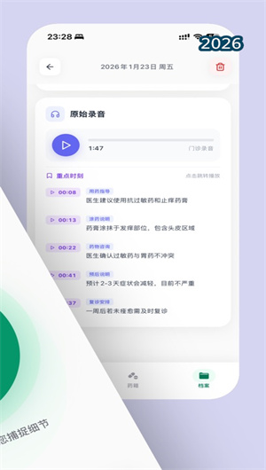 在音频分析过程中,系统独创了重点时刻自动标记功能。利用声学特征与语义结合的分析模型,系统能自动探测并标记出医生宣布重要诊断、解释严重性、开具新药或强调重要医嘱的精确时间点。在播放录音时,界面下方会显示一条带有这些关键标记点的时间轴,用户点击标记即可快速跳转到对应片段进行回听,无需在冗长录音中盲目寻找。该功能尤其适用于需要向其他医生转述病情或反复确认医嘱细节的场景,将信息定位效率提升了数倍。