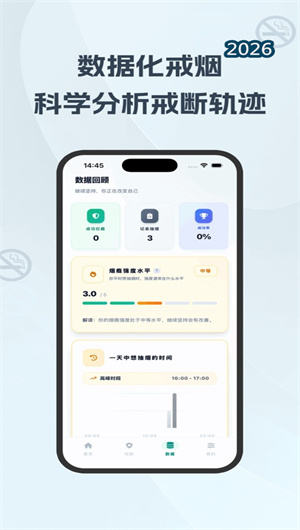 应用致力于将每一份努力都转化为可见的成就感。首页的 “成就仪表盘” 实时展示关键戒烟成效指标:累计无烟时长、成功拦截冲动次数、因戒烟而节省的金额以及避免的香烟支数。每一个数字的增长都是一次即时正向反馈。此外,周期性的 “数据回顾报告” 会对用户的 “冲动应对成功率” 与总体 “烟瘾强度水平” 进行趋势分析,用客观数据图表告诉用户:“你的尼古丁依赖度正在下降,你的自控能力在稳步增强。”这种量化进步追踪是巩固信心、防止复吸的关键。