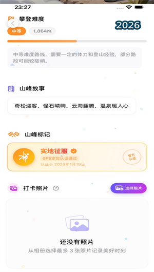 应用内置了精心设计的 “中华名山数据库” ,系统化收录了包括五岳、四大佛教名山、四大道教名山及珠穆朗玛峰等数十座具有文化象征与地理标志性的山峰。每座山都是一个独立的挑战任务单元,配有详细的海拔信息、地理坐标及攀登难度分级(如休闲、进阶、硬核、极限)。用户成功登顶并完成认证后,即可在应用的 “勋章墙” 中点亮对应的彩色山峰图标,完成从黑白到彩色的成就解锁过程。这种游戏化收集机制深度契合用户的收藏与征服心理,使每一次户外行程规划都充满目标感与仪式感,让名山挑战成为持续探索的强大动力。