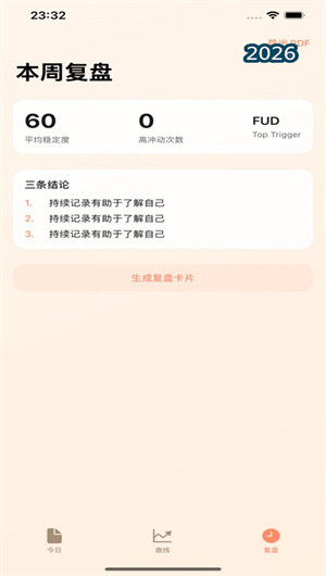 本应用的核心智能在于其数据分析与报告生成能力。系统每周会自动对用户的打卡数据进行深度挖掘,生成一份图文并茂的个人情绪周报。报告的核心是 “Big3情绪模式总结” ,即揭示过去一周中占据主导地位的情绪类型、最高频的情绪触发情景以及最显著的情绪转变时段。报告还会基于历史数据,智能识别用户个人的 “高冲动风险时刻” (如每周五下午或睡前),并提供前瞻性提示,帮助用户提前建立心理预期与应对策略,实现从被动反应到主动情绪预防的关键跨越。