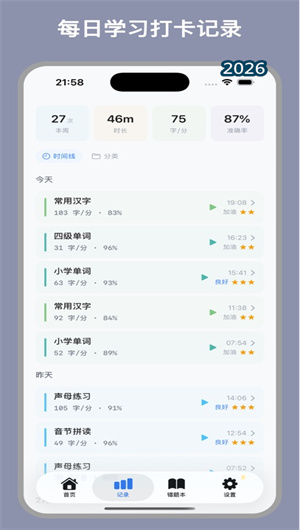 小妙打字通动态记录每一次练习中的错误字词,生成专属错题本。针对个人薄弱项进行反复强化训练,从源头消灭错别字,不留知识盲区。同时自动统计每日练习时长、字数及准确率曲线,多维度数据分析成长轨迹,让坚持更有动力。