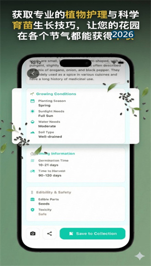 识别后,种子识别APP提供全方位种植信息,包括:理想播种期、光照要求、浇水频率、土壤建议、播种深度、发芽温度等关键参数。百科内容整合权威农业数据,图文并茂,让用户从“认识种子”到“种好植物”一步到位。该功能让83%的用户表示“再也不用到处查种植方法了”。