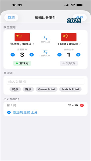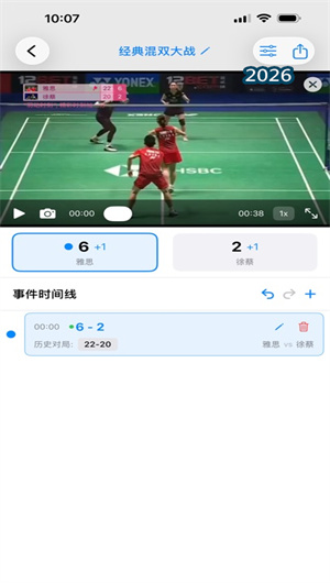 这是“羽动时刻”最核心的功能。进入记分模式后,屏幕下方会出现醒目的得分按钮。用户只需在视频播放过程中,每当一方得分时点击对应的“+1”按钮,系统便会自动记录该次得分事件,并同步更新屏幕上的当前比分。软件完全遵循羽毛球的每球得分制规则,每次得分后,发球权会自动切换到得分方,发球标识清晰可见。对于一场比赛可能有多局的情况,软件支持完整的多局管理,用户可以随时开启新的一局,并记录每一局的历史局比分(如21:18)。最终,所有这些比分信息都将被精确地“钉”在视频的时间轴上,确保比分与画面的精确同步。