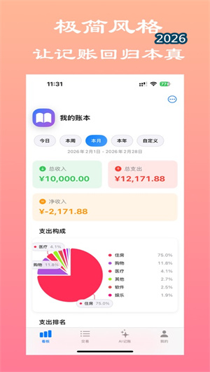 酷爱AI记账提供简洁的统计界面,只展示用户真正关心的数据:支出构成饼图直观显示各类消费占比,收入/支出/净收入总览一目了然。支持周期切换(今日/本月/本年/自定义),没有复杂的财务模型,没有堆砌的报表。该功能让91%的用户表示“一眼就看明白钱花哪了”。