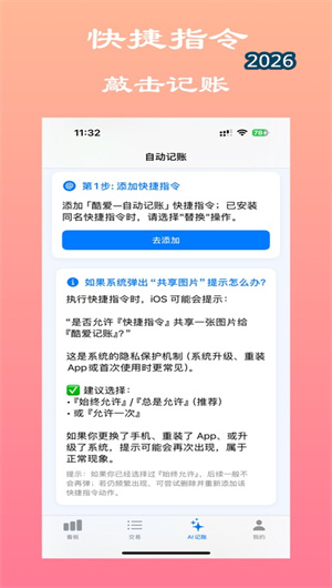 酷爱AI记账支持用户自定义快捷指令,可设置截图后自动唤起记账、定时截图提醒、一键生成周报等,进一步提升记账效率。