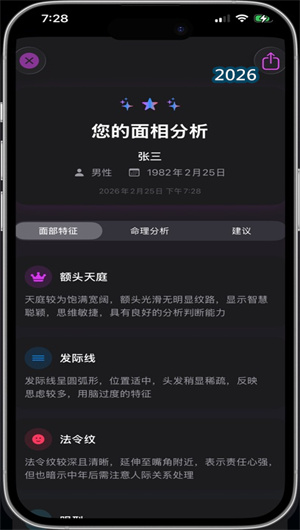 相面大师将枯燥的文本报告转化为生动的交互式结果展示,大大提升了阅读的趣味性和可理解性。每个维度的分析结果都以卡片形式呈现,配有对应的颜色分类——金色代表优势领域、银色代表需要关注的方面、紫色代表潜力所在。用户可以点击任意卡片展开详细解读,查看具体的面部特征如何影响这一维度。分析报告中还配有面部热力图,直观标注出哪些部位对当前结论影响最大,让用户一目了然地理解面相与命运的对应关系。对于有趣的解读结果,用户可以一键生成精美的分享卡片,通过社交平台与朋友家人分享,既可以交流探讨,也可以作为留念。这种交互设计和社交功能的加入,让面相解读从单向的信息输出变成了双向的探索体验,大大增强了用户的参与感和分享欲。