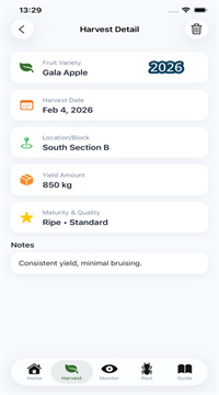 2. 采收追踪与生产历史档案: 果安芯app提供了完善的采收追踪与生产历史档案功能,让每一次收获都有据可查、有图可证。用户可在采收时记录品种(红富士、黄金梨、水蜜桃等)、采收地块、产量(公斤)、果径分布(大果/中果/小果占比)、成熟度(七成熟、九成熟)、果实品质(糖度、硬度、着色率),并支持上传现场照片或视频。系统自动生成采收批次号,关联该批次的所有数据,形成一份完整的生产档案。用户可随时检索历史采收记录,按品种、年份、地块等维度查看产量趋势图,对比不同年份同一品种的产量变化。对于优质批次,用户可标记“留种”或“重点推广”标签,作为后续种植决策的参考。这种将采收记录与档案管理深度融合的设计,让果园的生产经验得以数字化沉淀,避免因人员流动或记忆模糊导致的经验流失。