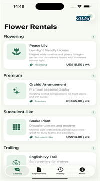 1、按品类、场景、租金筛花,高清图、养护难度、含不含盆一次看清,30秒锁定心仪绿植。