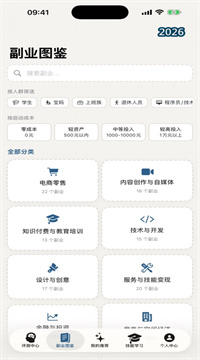 3. 软件里有13大类副业和好多细分项目。每个项目怎么启动、要花多少钱、能赚多少、怎么发展、需要什么技能、怎么找客户、学什么、有什么建议,都能查清楚。