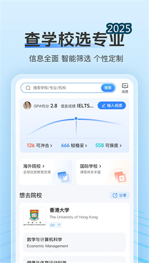 1. 留学君查学校功能采用留学君多维筛选系统,用户可通过设置地理位置、专业方向、录取要求等条件精准定位目标院校。平台集成留学君院校画像技术,详细展示学校历史、师资力量、科研实力等关键指标,配合留学君对比工具可同时对比多所院校优势劣势,帮助用户做出最优选择。系统还会根据用户浏览行为通过留学君智能推送算法推荐相关院校信息。