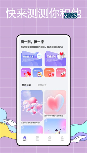 2. 平台的缘分测试系统采用心理学评估模型和关系预测算法,提供深度的情感关系分析。该功能通过爱情运势评估模块和灵魂伴侣匹配引擎,对用户的人格特质、情感需求进行多维度测评。在星座配对分析环节,系统整合了占星学数据库和性格兼容性算法,生成详细的配对报告和改善建议。独特的缘分指数计算模型和情感发展预测功能,帮助用户清晰了解当前关系状态,并为关系进阶提供专业指导。