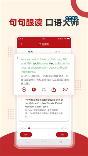 经济学人APP的语音评测系统提供标准英音与美音朗读,原文同步高亮帮助跟读练习。创新的AI口语教练对用户的跟读进行实时评分,发音纠正针对问题音素专项训练。专业的语速调节支持0.5倍至2倍速无级调整,难点循环专注训练薄弱环节,构建了完整的听说读写学习闭环。