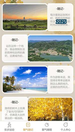 朝气乐步App是一款创新性的健康生活管理平台,巧妙融合步数记录、感想随记和睡眠管理三大核心功能,构建了全方位的个人健康监测与改善体系。该应用以"让生活充满健康与朝气"为核心理念,通过科学的数据追踪和人性化的交互设计,帮助用户建立规律的运动习惯、完善的情绪记录体系和健康的睡眠模式。朝气乐步致力于为用户提供从身体活动到心理状态的全方位健康支持,目前已成为超过300万用户的健康生活伴侣,日均记录健康数据超百万条。