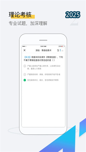 2. 专业化理论考核系统基于内镜培训大纲构建了多维试题数据库,题型涵盖单选题、多选题、病例分析题及影像判读题。系统支持智能组卷功能,可根据培训阶段自动生成侧重不同的考核试卷,所有试题均附带详细的答案解析与知识点溯源。学员完成考核后,系统即时生成成绩分析报告,精准定位知识薄弱环节,并推荐相应的强化学习课件,实现“考-学-补”的闭环,有效加深技术原理理解。