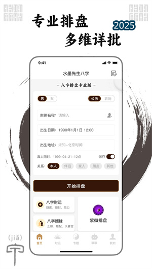 水墨先生APP的核心功能是其高度专业的八字排盘系统。用户输入精确的出生年月日时(支持真太阳时与北京时间切换)及出生地后,系统将依据六十甲子纳音与五虎遁年干法则,自动推算出用户的年柱、月柱、日柱、时柱,完成四柱八字的精准排定。排盘结果不仅展示天干地支、五行旺衰、十神定位,更深入呈现十二长生、命宫胎元、地支藏干等核心信息。基于此基础命盘,软件可一键生成包括健康盘、姻缘盘、事业盘、财运盘在内的专项命盘分析,每个专项均结合神煞系统(如桃花煞、羊刃、禄神)与流年大运进行综合研判,为用户提供立体化的命理画像。