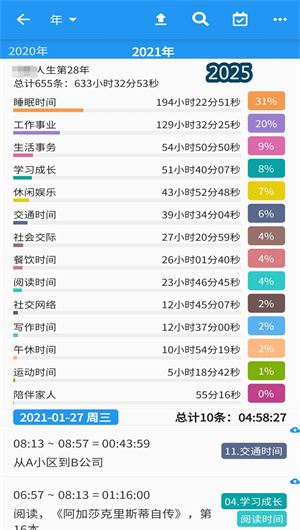 基于详实的时间记录数据,时间统计APP的 “数据分析中心” 提供强大的统计与可视化能力。用户可通过 “日/周/月/年时间分布视图”,直观查看不同周期内各类活动的时间占比与变化趋势。环形统计图与堆叠柱状图清晰展示时间分配结构,时间线对比功能支持将不同日、周或月份的活动分布进行平行比较。进阶的数据透视分析允许用户按自定义的维度(如项目、情绪、场所)对时间投入进行交叉统计,生成个性化的时间分析报告,帮助用户精准定位时间消耗大户与高效时段。