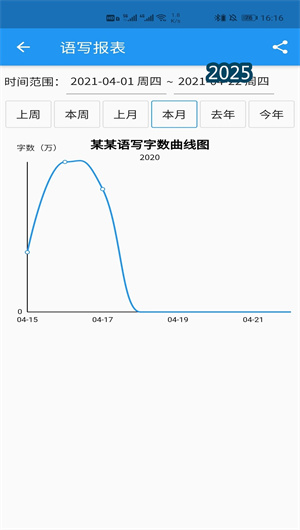 基于每一次的语音写作实践,APP的 “写作数据中心” 会生成详尽的数据报告。用户可以清晰查看单次或累计的 “写作总字数” 、 “有效录音时长” 、 “平均语速” 等基础指标。更深入的分析包括 “写作词频统计图” ,直观展示常用词汇及其出现频率,帮助用户洞察自己的语言习惯与思维模式焦点。系统还提供 “写作时间分布热力图”,分析用户在一天中不同时段的创作活跃度与产出量,辅助用户找到个人的“黄金创作时段”。所有历史写作内容均支持时间线回溯与全文关键词搜索,便于回顾特定主题的思考脉络。