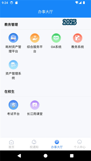 “线上办事大厅” 是APP的核心功能模块,它按照 “教学科研”、 “学生事务”、 “生活服务”、 “行政办公” 等场景对各类应用服务进行分类聚合。该大厅不仅集成了学院自研的 “移动端考试平台”、 “资产在线报修与管理系统”、 “会议室预约系统” 等原生功能,更通过 “标准化H5应用容器” 与 “第三方APP深度链接”,无缝接入了成绩查询、课表查看、一卡通充值、网络缴费、图书借阅续借等数十项服务。所有接入的服务均通过后台的 “统一身份认证中心” 实现 “一次登录,全网通办”,用户无需在不同系统间反复输入账号密码,极大地提升了办事效率。