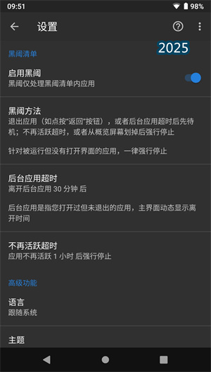 1. 黑阈的核心功能是建立了一套基于 “黑阈清单”的应用甄别与管理体系。用户可以将需要常驻后台接收通知或执行同步任务的应用(如微信、邮件客户端)添加至清单内,并为其开启 “允许同步” 权限。对于清单外的应用,黑阈会启动严格的后台生命周期监控。当用户通过返回键或Home键退出应用界面后,系统首先会尝试将其置于应用待机状态;若待机超时或用户从概览屏幕(Recents Screen)手动划掉该应用,黑阈则会触发更彻底的 “强行停止” 指令,终止其所有后台进程与服务。