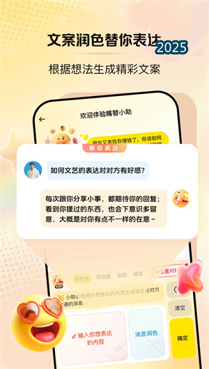 嘴替小助APP是一款专为不擅情感表达、渴望提升社交沟通质量的用户设计的智能聊天辅助工具。针对“有喜欢的TA,却总在聊天框前犹豫徘徊”这一普遍社交困境,本应用提供了一套完整而贴心的解决方案。其核心使命是让用户用【嘴替小助】,聊天不迷茫,帮帮有方向,通过引入专业的沟通智慧与情境化建议,轻松解锁高情商聊天模式。APP以三大核心功能——帮回复、帮表达与设置心动的TA——为支柱,结合先进的人工智能分析与情感计算技术,旨在成为用户社交旅程中值得信赖的“数字军师”,帮助用户跨越表达障碍,建立更温暖、更有效的人际连接。