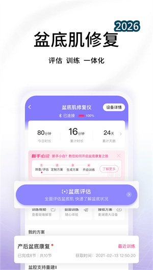 澜渟APP的核心功能是作为澜渟系列智能硬件的控制中枢与数据终端。用户可通过蓝牙轻松连接盆底肌修复仪,开启专业的评估训练一体化流程:首先进行精准的盆底肌力评估,生成个性化肌力报告;随后,系统根据评估结果智能推荐或定制包含不同强度、频率的生物反馈训练方案。训练过程中,设备实时采集肌电信号,并在APP上以直观的动画或曲线进行可视化反馈,指导用户正确收缩与放松。这种 “硬件+软件+方案” 的闭环,将复杂的临床康复技术转化为安全、有效、可在家执行的标准康复体验,是平台实现 “塑造产后更美的你” 目标的技术基石。
