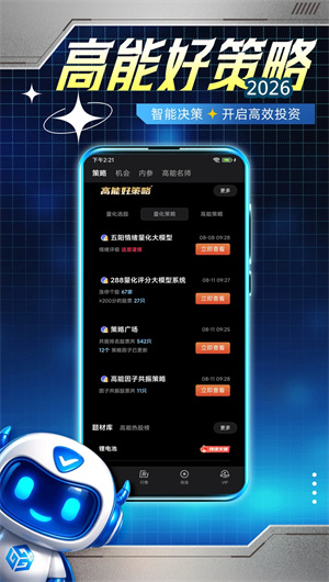 五星量化APP是一款定位为智能投资决策专家的专业级股票投资分析工具,深度融合人工智能算法与海量金融大数据,构建了集量化策略模型、市场情绪解析与资金动向追踪于一体的多维赋能决策平台。该应用旨在通过系统性的量化投研体系,帮助用户高效挖掘市场潜在机会并科学规避风险。其核心的五星量化引擎通过动态评估与评分机制,如 「五星选股」 与 「288评分」 ,为用户提供清晰的投资标的质量参考。同时,平台整合了多因子策略平台、热点题材库与专业内参系统,形成了覆盖分析、选股、策略、资讯的完整专业工具矩阵,日均处理市场数据超亿条,已成为辅助投资者进行理性决策的数字化智囊。