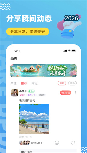 饭友APP将社交流程压缩至“点击头像-发起问候”两步,用户浏览推荐列表时,可对心动对象发送预置问候语(“你好呀,看你也喜欢露营”),对方接受后即可开启语音/视频通话。系统支持实时美颜滤镜与虚拟背景(可替换为海边/星空等场景),降低视频社交的心理门槛。该功能使日均互动对数达37万对。