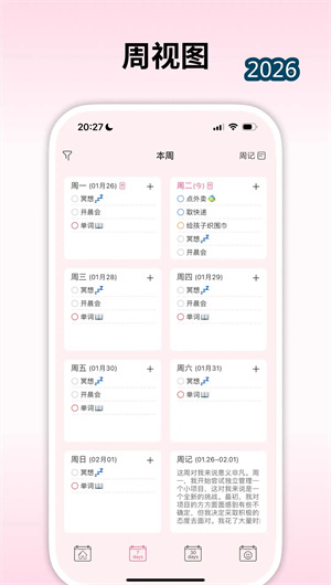 1. 日程管理与多视图切换: 纯纯周记的日程管理功能摒弃了复杂的设置,回归计划本质。用户可以轻松创建日程,设置重复任务(如每天、每周、每月),添加标签分类。周视图和月视图自由切换,让用户一眼看到每天是否有安排、是否完成。更独特的是,视图中同时标记“是否写过日记”,将计划与记录自然连接。例如在月视图中,每个日期下方都有一个小圆点,写日记的日期亮起,未写的保持灰色——时间分布和生活记录一目了然。这种设计让计划不再是冰冷的待办清单,而是有温度的生活轨迹。