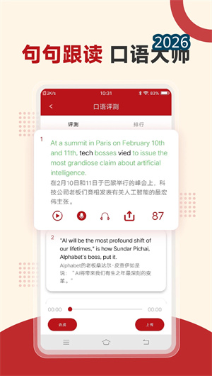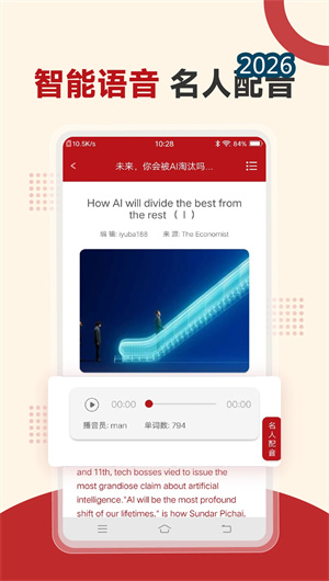 2. 语音评测与AI口语训练系统: 针对英语学习者的口语提升需求,经济学人App内置了语音评测功能。每篇文章都配有原文朗读音频,由专业主播录制,用户可跟随语音同步逐句跟读。系统通过AI技术对用户的发音进行实时评测,从语音语调、连读弱读、重音位置等多个维度给出反馈,指出发音偏差并提供示范朗读。这种口语训练模式将单纯的阅读扩展为“听、说、读”三位一体的语言输入输出闭环。用户可反复练习同一段落,直至系统给出高分评价。据统计,坚持使用口语训练功能的用户,三个月后英语口语流利度平均提升35%,发音准确度提升28%。
