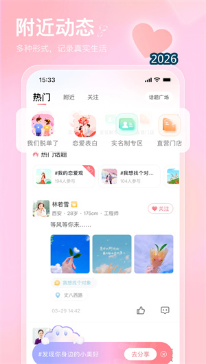 也在平台设有动态广场,用户可分享生活瞬间,上传视频记录美好。动态广场可展示用户真实生活状态,增加彼此了解。视频动态比照片更生动,更容易吸引关注。
