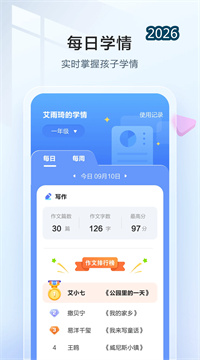 2、家长端可发语音或文字任务,孩子端限时完成并回传录音,系统自动打分,亲互动数据生成家庭排行榜,陪写变游戏;